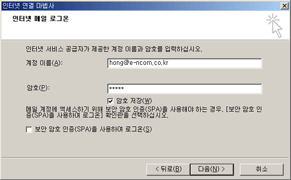 그리고 암호를 입력후 다음을 클릭합니다.(보안 암호 인증(SPA)을 사용하여 로그온은 체크 하지 않습니다.)